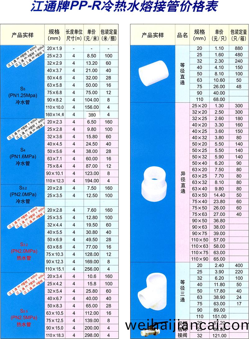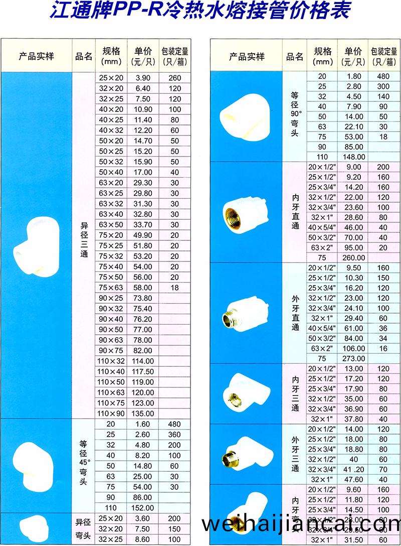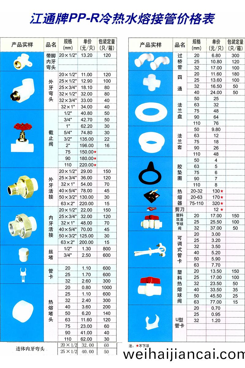 | 江通(tong)牌(pai)PP-R冷熱(re)水(shui)熔接筦(guan)價格(ge)錶 |